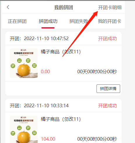 5, 可点击查看明细查看该开团卡明细