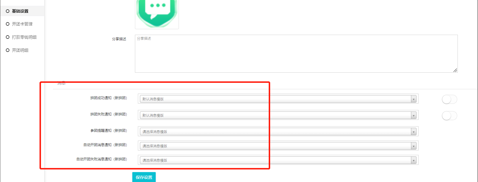7,拼团列表分享设置,设置好后拼团聚合页分享按照设置的内容分享,若不设置则按照商城设置—分享设置处分享