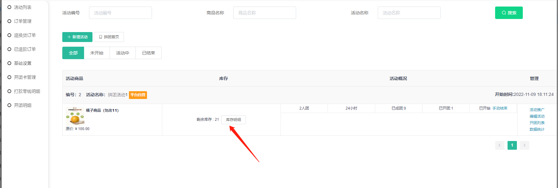 2, 活动概况:已开团数量和已成团数量,可手动结束拼团