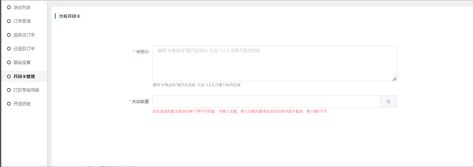 6, 分发开团卡:输入会员昵称、每个会员分发张数。开团卡的有效期从分发的时候开始计算。分发开团卡可分发负数,发放负数优先扣除时间快结束的