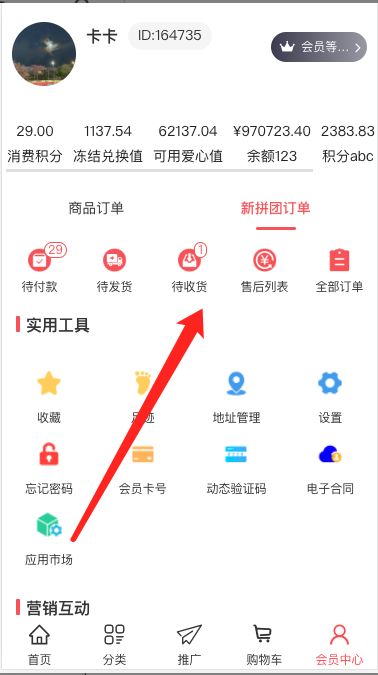 1, 会员中心,营销模块显示新拼团入口,点击进入查看我的拼团