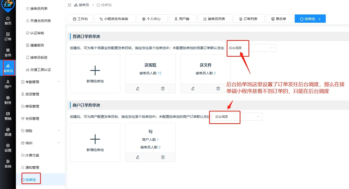 5.后台抢单池里设置了默认发往后台调度
