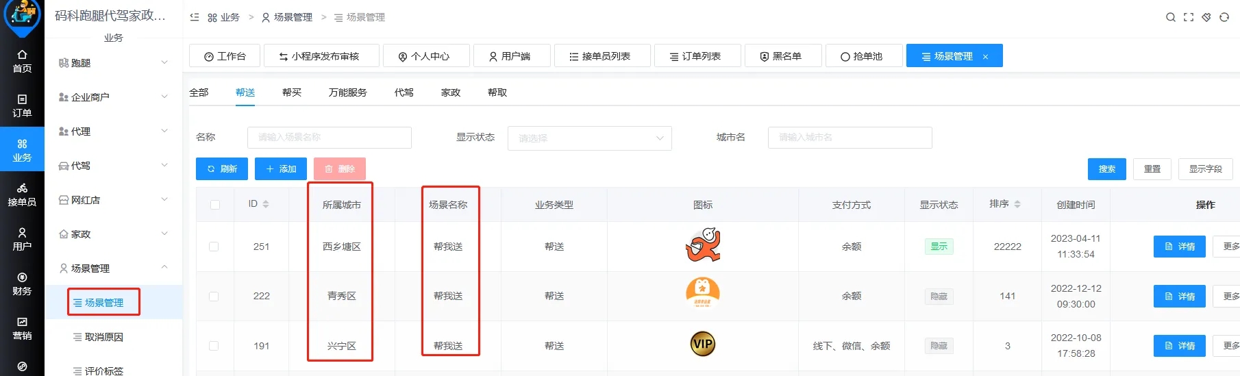举例:后台添加了三个场景都叫“帮我送”,三个场景分别绑定的城市地区是西乡塘区、青秀区、兴宁区。接单员:碼皇只认证了西乡塘区的“帮我送”,但是用户下单时,选择了青秀区的帮我送或者兴宁区的帮我送来下单,那么接单员碼皇也是无法看到订单的。