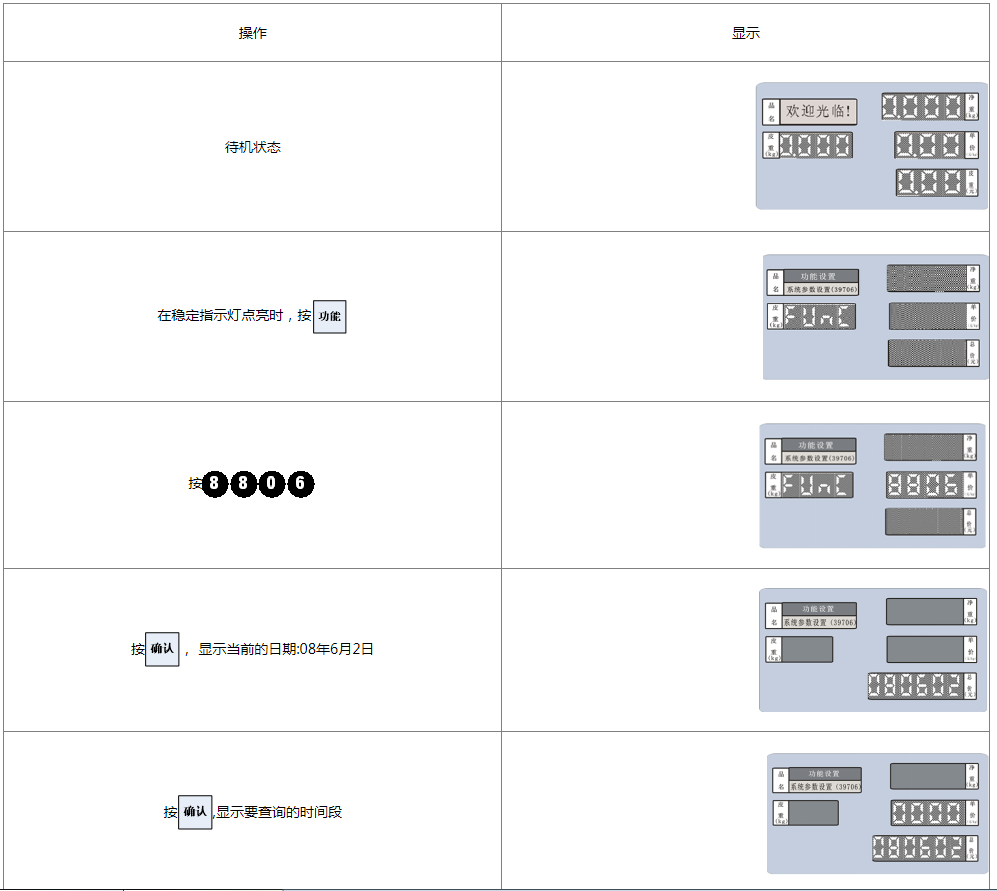 阅读本手册时,操作见表格最左列,表格其余列为实施最左列操作后条码打印计价秤各个窗口的显示内容;