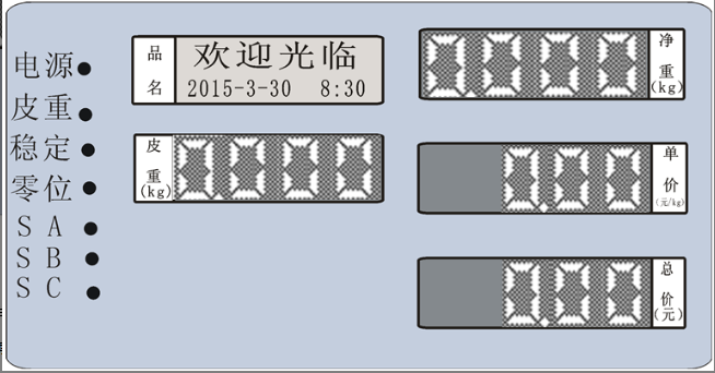 1.条码打印计价秤显示面示意图: