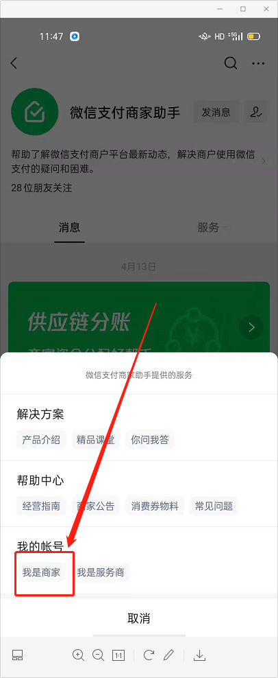 3.超级管理员,在微信端搜索(微信支付商家助手)关注公众号。