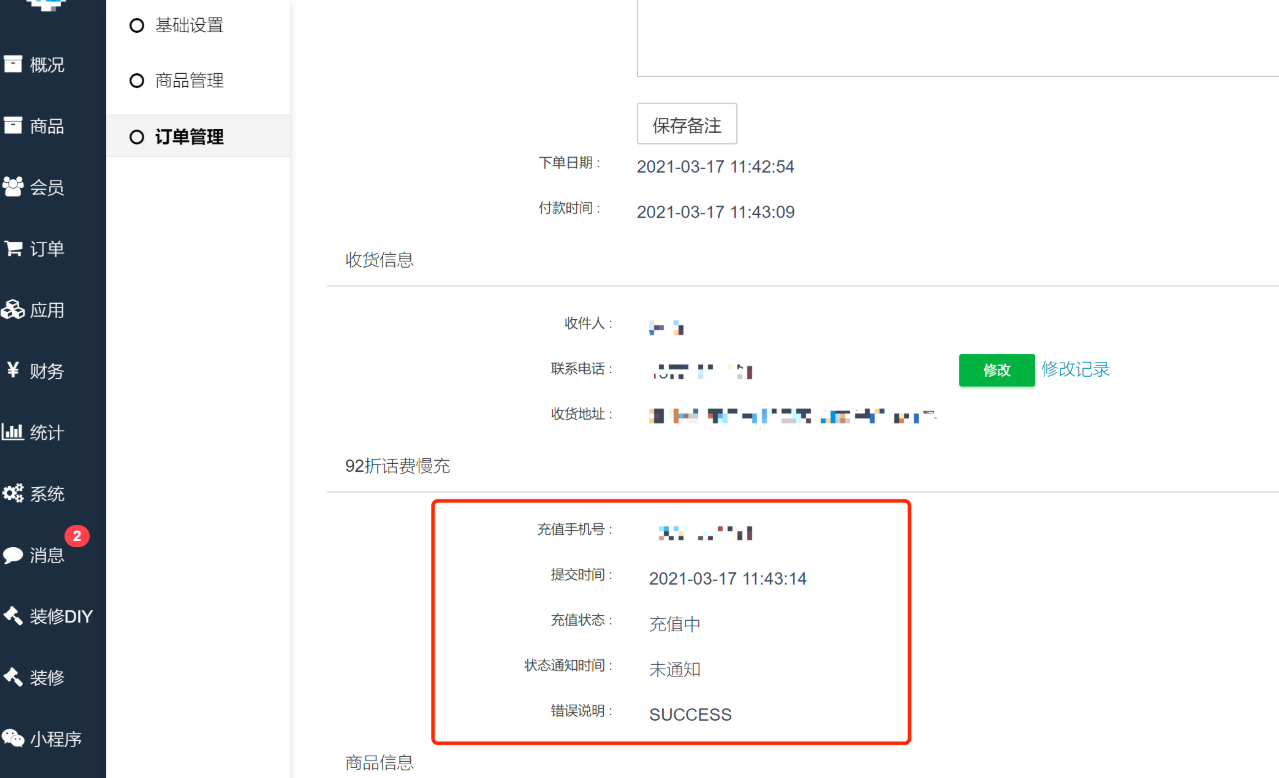 订单详情中可查看充值状态、记录等。