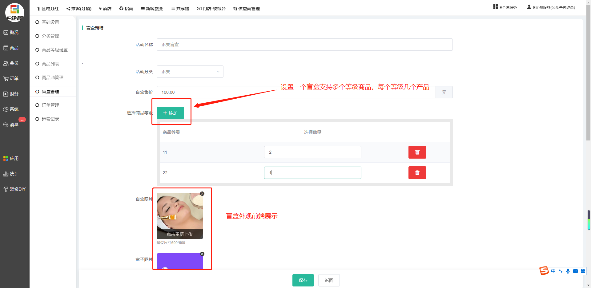 1) 添加盲盒,设置盲盒名称、盲盒分类、商品等级、购买该盲盒所需选择的商品数量,盲盒图片,盒子图片,活动时间