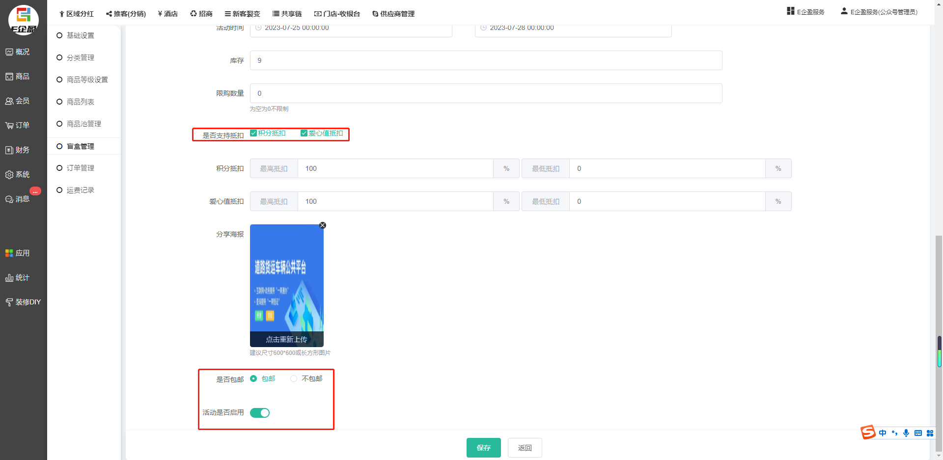 2) 盲盒库存、限购数量、是否支持积分/爱心值抵扣,分享海报