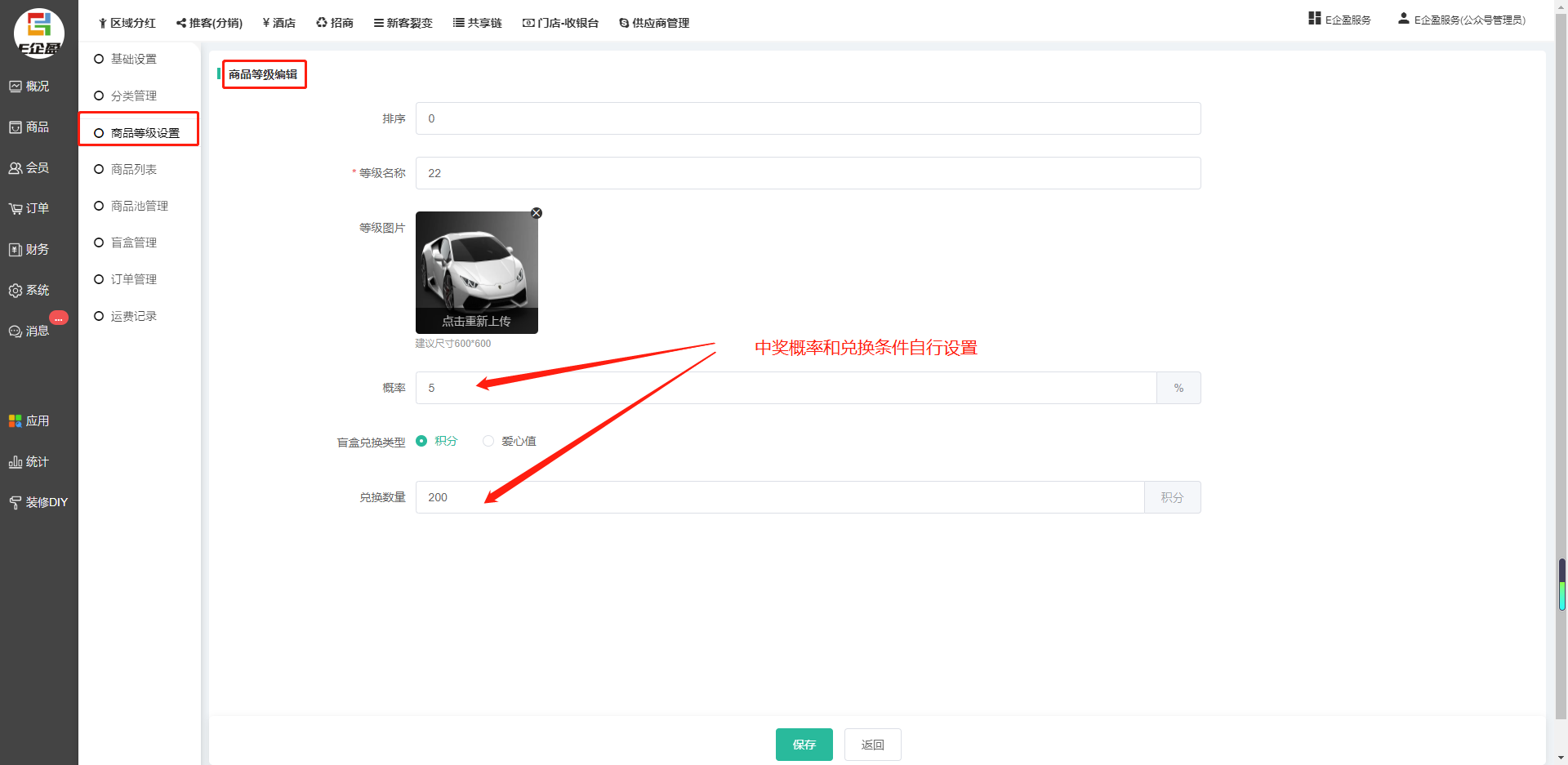 2)添加等级,设置等级排序、等级名称、等级图片、中奖概率,盲盒兑换类型,兑换数量