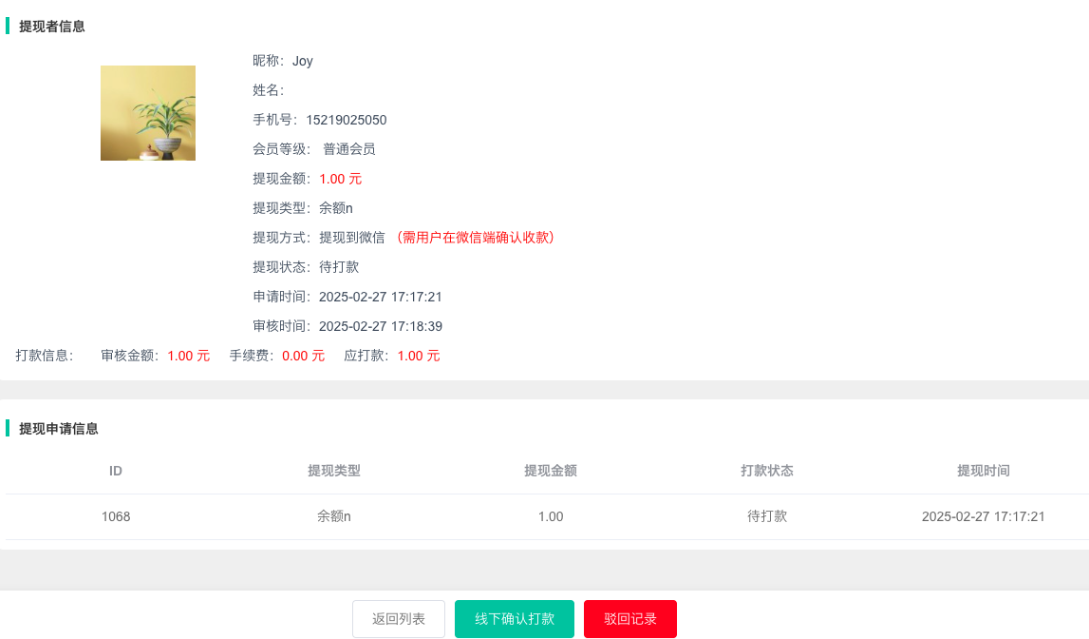 后台审核通过,用户在前端会员中心--供应商管理--提现记录进行确认打款