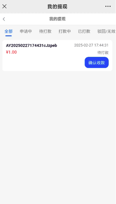 注意:这个页面的确认收款按钮会一直显示,需要点击进入才判断这笔提现是否打款到账;