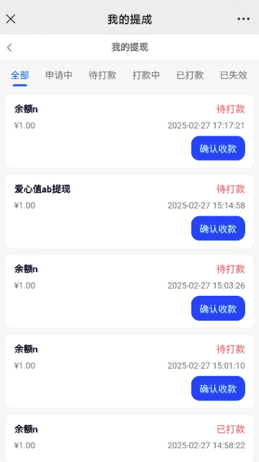 收入、余额提现,后台审核后,前端推广中心--收入--右上角提现记录--显示确认收款按钮(仅公众号、小程序,云打包APP显示,聚合APP没有)