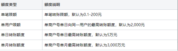 完成开通后,你需使用开通时选择的转账场景所对应的场景ID发起转账,同时获得转账额度如下表